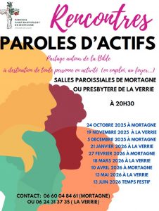 Paroles d’actifs Date 21 mer Jan2026 Heure 20h30 - 22h00 Type évènement Rencontre Lieu Salle du Presbytère La verrie Catégorie Paroisse
